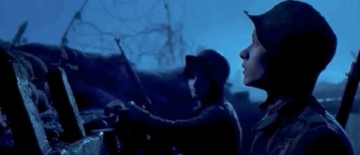新兵躲在掩体里捂着耳朵瑟瑟发抖,老兵用正常的眼神看着他们哭。