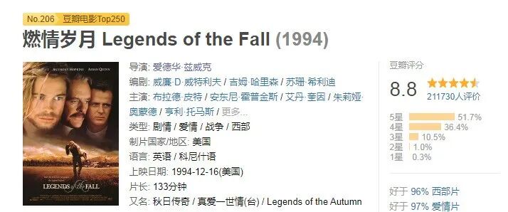 今天小编给推荐一部电影---《燃情岁月》,是由爱德华·兹威克导演的一部上映于1994年的爱情、剧情、战争、西部电影。
