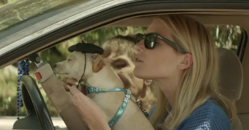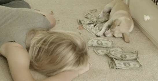 她和狗狗躺在钱上,满足着突然到来的喜悦。
