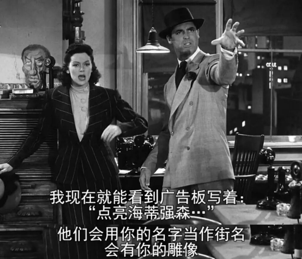 ©️《女友礼拜五》这绝对是一个听觉大于视觉的典型案例,影响了后来的很多电影创作。比利怀尔德甚至在70年代专门拍了一部电影,叫《满城风雨》,就是为了向这种神经喜剧致敬。105分钟,2400句对白,每个人都像机关枪,或者某种上了发条的机器,互相牵引着。不仅语速快,还懂得妙语连珠的诙谐讽刺,还随身携带着观点、哲学思辨和奇思妙想的输出。