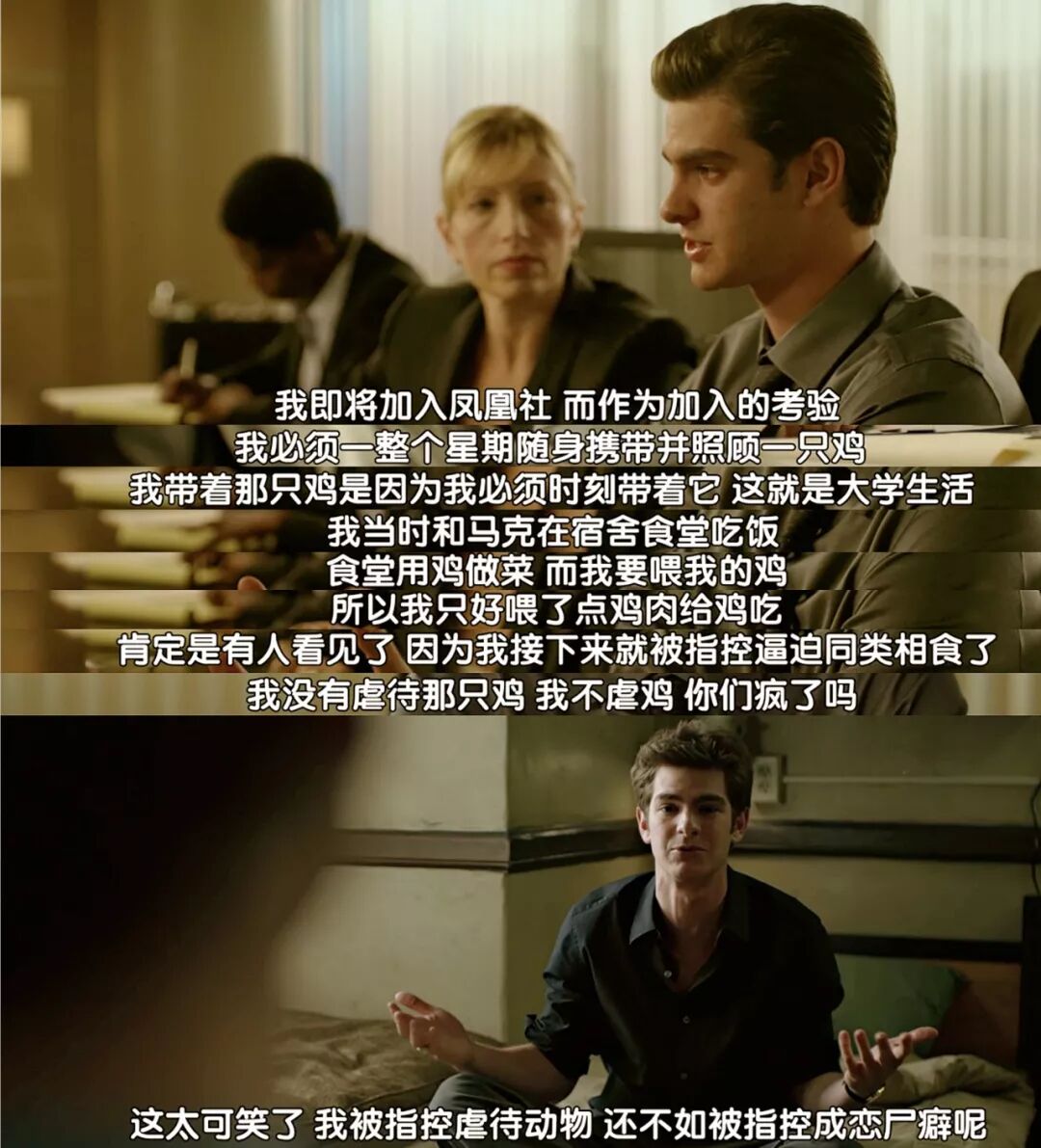 ©️《波拉特》还有编剧艾伦·索金,他从小就喜欢听人对话,对语言和声音有着天生的敏感。他把这种敏感融入到电影《茉莉牌局》和《社交网络》中,两部电影都充满了快节奏和高密度的对白,让人欲罢不能。尤其是后者,一个由安德鲁加菲尔德扮演的大学生,围着一只鸡喋喋不休,让人笑到流泪。