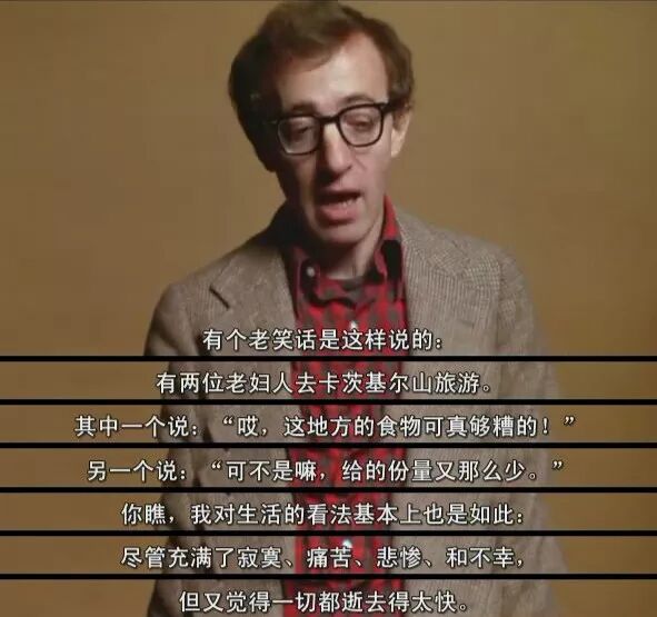 ©️从上到下依次为:《让子弹飞》、《落水狗》、《汉娜姐妹》说起伍迪艾伦,其实他早期是个喜剧演员,写过一些剧本,所以在他的电影里,一直都有单口相声和舞台元素。比如《安妮霍尔》里的伍迪,就像一个单口相声演员站在镜头前,喋喋不休,自言自语。那些喋喋不休的人非常有趣,关于爱情和人生的哲学充满了幽默和戏谑。
