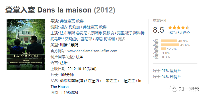 电影改编自西班牙舞台剧《最后一排的男孩》,导演巧妙拼接偷窥文学与扑朔迷离的现实断面,用似真似幻、充满层次感的创作故事挑战情欲道德禁区。本片入围法国凯撒奖六项大奖,获多伦多电影节国际影评人费比西奖和西班牙圣塞巴斯蒂安电影节最佳影片金贝壳奖,同时入选欧洲年度最佳电影之一。