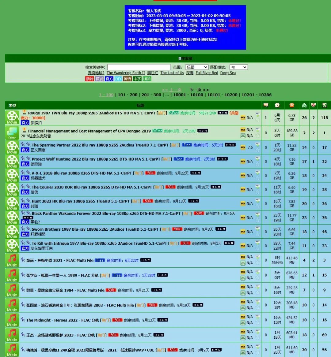 网站资源类别为:电影,电视剧,动漫,纪录片,综艺,音乐,其它.影视类资源限发布Blu-rayUHD,Blu-ray,x264/x265,web,hdtv的,不能发枪版与含广告的;[鉴于大家对原盘与remux的需求,不再限制发布了,于2022.08.15更新]发布种子,简介里图片请图床形式,不要附件发到网站。新人考核要求:上传量30G,下载量30G,魔力3000,时间30天。种子HR要求:种子下载完10天内累计保种时间24小时或种子上传量大于2倍种子体积。未达标HR数达到20(HR警告数)封号。[HR警告数于2022.10.15由100改为20]