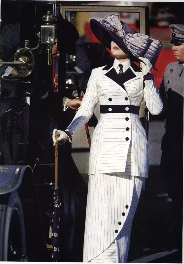©影片《伊丽莎白》中凯特·布兰切特扮演的伊丽莎白一世女王,身穿紧胸衣端坐着直到1912年泰坦尼克号起航,凯特·温特拉斯扮演的女主罗丝才慢慢从车上下来。此时,紧胸衣即将落入历史的尘埃,黄蜂般的身影也在渐渐消失。你可以看到在罗丝硕大的遮阳帽下,一条白色条纹西装裙正好衬托出她丰满的腰肢。