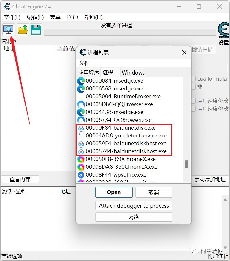 在当前进程列表里,找到百度网盘 baidunetdiskhost.exe 进程,其中有两个都是以“host”结尾的进程,这里我们需要碰碰运气随便选择一个进程,点击Open按钮。