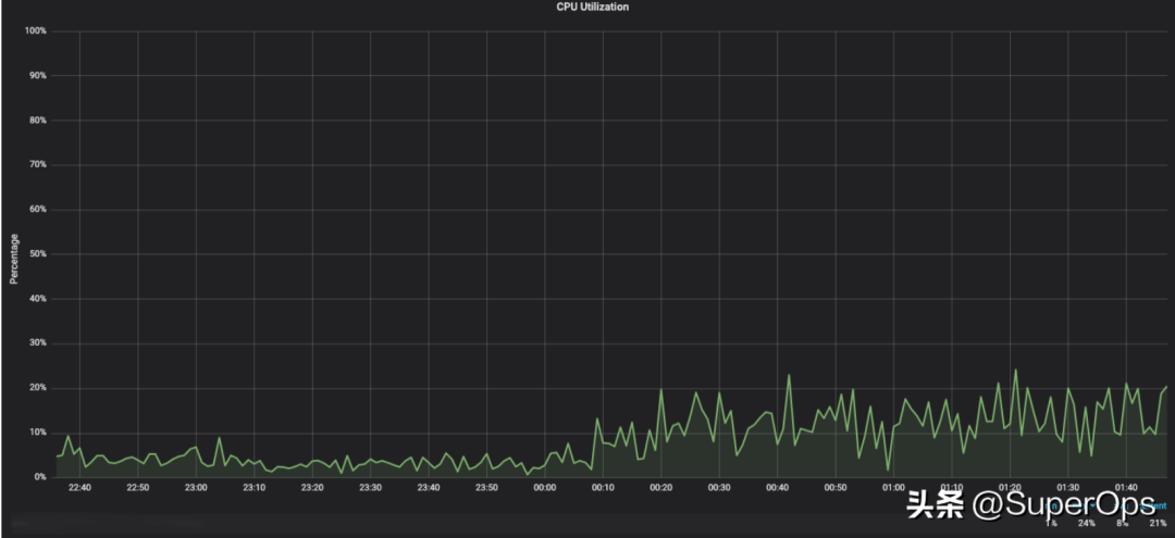 这是一个 cpu 利用率图表,描述了处理 Web 请求的应用程序的 cpu 使用情况。即使将使用情况聚合到分钟级别,我们也看到该程序在 1% 到 24% 的 cpu 利用率范围内运行。