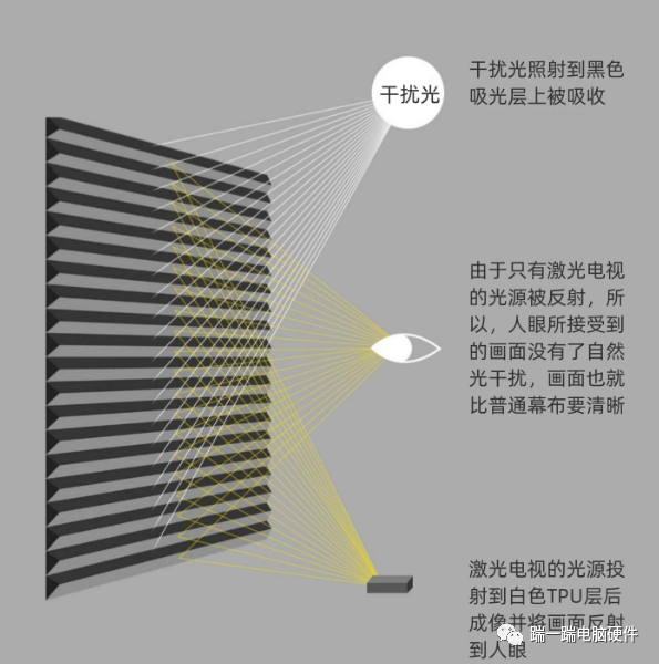 现在激光电视总是搭配抗光幕,它是一种强增益的幕布,凡是分为两大种类,第一种就是激光电视应用的,短焦抗光幕,现在也有长焦抗光幕。它们是通过表面的特殊涂层将光线反射到特定方向的技术,因此可以屏蔽很多杂乱的环境光,可以很明显的提升画面的亮度。
