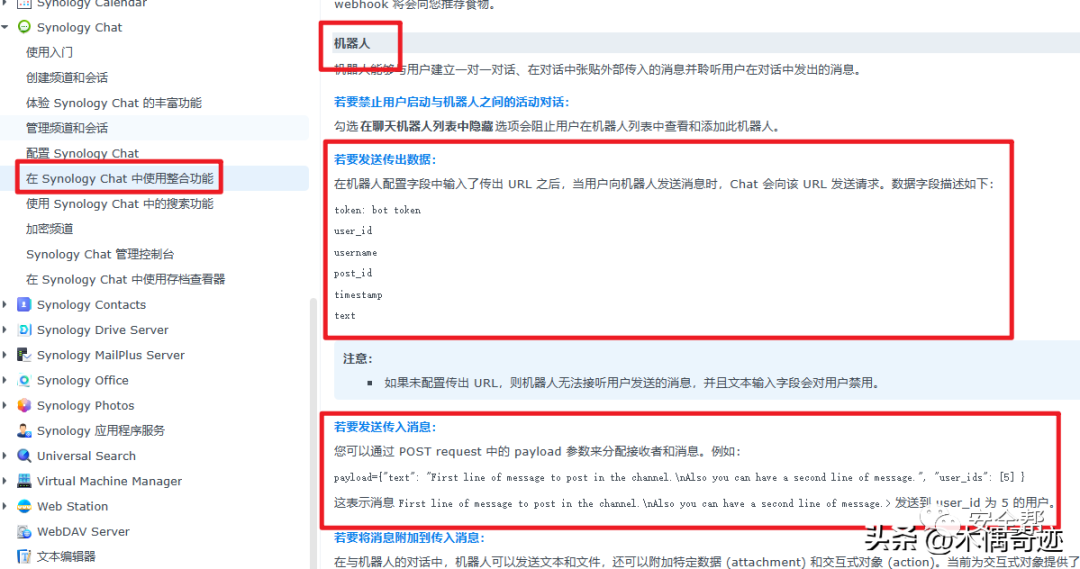 打开群晖的帮助文档,找到 Synology Chat -> 在Synology Chat中使用整合功能 -> 机器人。