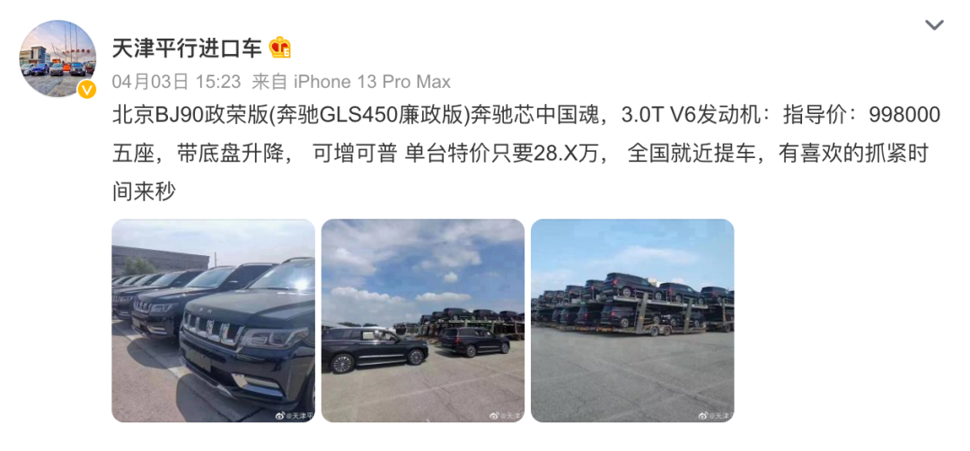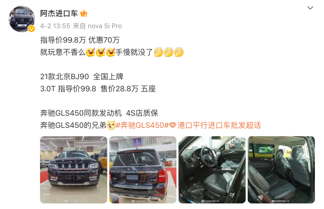 近日,北京BJ90狂降71万的消息直接被推上汽车圈热搜。综合多方消息来看,市场指导售价99.8万元的北京BJ90 3.0T政荣版,裸车最低价仅需28.8万元,相当于2.8折入手新车,再加上保险和购置税,基本30万元左右就能落地国产“GLS”。需要注意的是,能够以如此低的价格购入,基本都是2-3年的库存车,而且非4S店渠道销售,也就是不提供整车质保。简单来说,30万想要买北京BJ90确实可以,但是一旦出现维修,却是一笔不小的数目。2015洛杉矶车展上,梅赛德斯-奔驰发布中期改款GLS级车型,当时北京汽车为了提高豪华SUV的研发能力,并填补部分政企单位的市场空白,选择与梅赛德斯-奔驰进行技术引进,引进的便是刚刚完成中期改款的GLS级(底盘代号X166),并且按照奔驰供应体系引进了全套供应商。不过,BJ90原计划在2016年推向市场,但直到2019年12月才上市销售,而且该车上市后并没有面向普通消费者销售,而是作为国事出行队列、国宾护卫保障及G20峰会专用车等。外观方面,北京BJ90延续BJ系列SUV的家族设计元素,巨大的镀铬五孔前格栅非常具有辨识度,与两侧造型方正的前大灯组相搭配。同时,前大灯内部采用较多镀铬饰条装饰,转向灯则借鉴了奔驰的设计。尺寸方面,BJ90的长宽高分别为5171/1995/1902mm,轴距3100mm,这是一款全尺寸SUV,在五座布局下的空间称得上无敌。内饰方面,BJ90更能够看出奔驰的设计,但同样进行了一些改变,例如将奔驰家族式的门板座椅调节按键放在中央扶手箱前,悬浮式中控屏改成了内嵌式,传统的指针式仪表盘搭配三辐式多功能方向盘也是奔驰原厂样式,仅仅是奔驰LOGO换成了北汽LOGO。更能够体现换壳的是在动力方面,BJ90搭载GLS级同款代号为M276的3.0T双涡轮增压V6发动机,最大功率333马力,峰值扭矩480牛·米,与之匹配的是9AT变速箱,并配备四轮驱动系统和主动空气悬架。严格来讲,BJ90并不是国产车。按照相关的说法,BJ90其实是GLS级进口至国内市场,北京汽车基于家族设计语言对其进行改造,因此从整车设计来看与GLS级有一定的差别,但其核心还是GLS级。因此,BJ90搭载的发动机是GLS级同款,大型零部件则来自GLS生产地,小型零部件例如螺丝钉、橡胶件以及卡扣等则来自奔驰德国工厂,升起底盘会发现悬架组件、避震等都能看到奔驰LOGO。所以,如果BJ90出现故障,涉及到零部件维修更换,基本要去奔驰4S店。说到这里,你可能会问,为什么BJ90能够狂降71万。其实,BJ90在推出山河经典版之前,属于特殊用途特供车型,不对外进行销售,更多是满足特殊部门的采购需求,但随着湖北打响降价的第一枪,以及叠加国六B的即将实施,BJ90面临着巨大的销售压力。无可否认的是,这是一款相当完美并且性价比无敌的中国全尺寸SUV。虽然BJ90狂降71万看起来十分诱人,但选择它也必须考虑使用成本。虽然3.0T车型最低只需要30万元左右就能落地,但考虑到其零部件大部分为奔驰进口,维修费用会相当高昂,这也是用户购入BJ90不得不考虑的问题。实际上,在2022年12月,北京越野推出了BJ90山河经典版车型,售价区间为47.80-49.80万元,和以往对公销售形式有所不同,新车上市后将转向对私销售,普通消费者也可以买到BJ90,而叠加终端市场优惠,BJ90山河经典版预计落地40万元左右。那么,相比之下,BJ90山河经典版车型反而更适合个人消费者,除了车款新配置高外,质保也能为消费者省下不小的费用。![]()