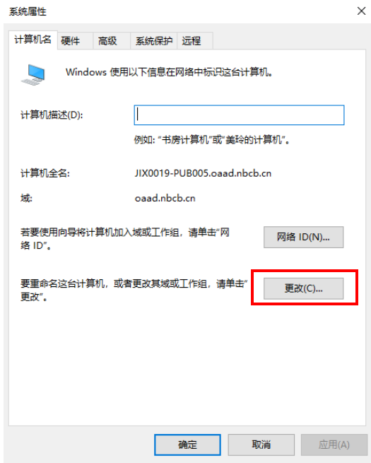 点击“更改”,根据查询得到的计算机名填入(计算机重命名与计算机描述请勿搞混,请再三确认计算机名的正确性)