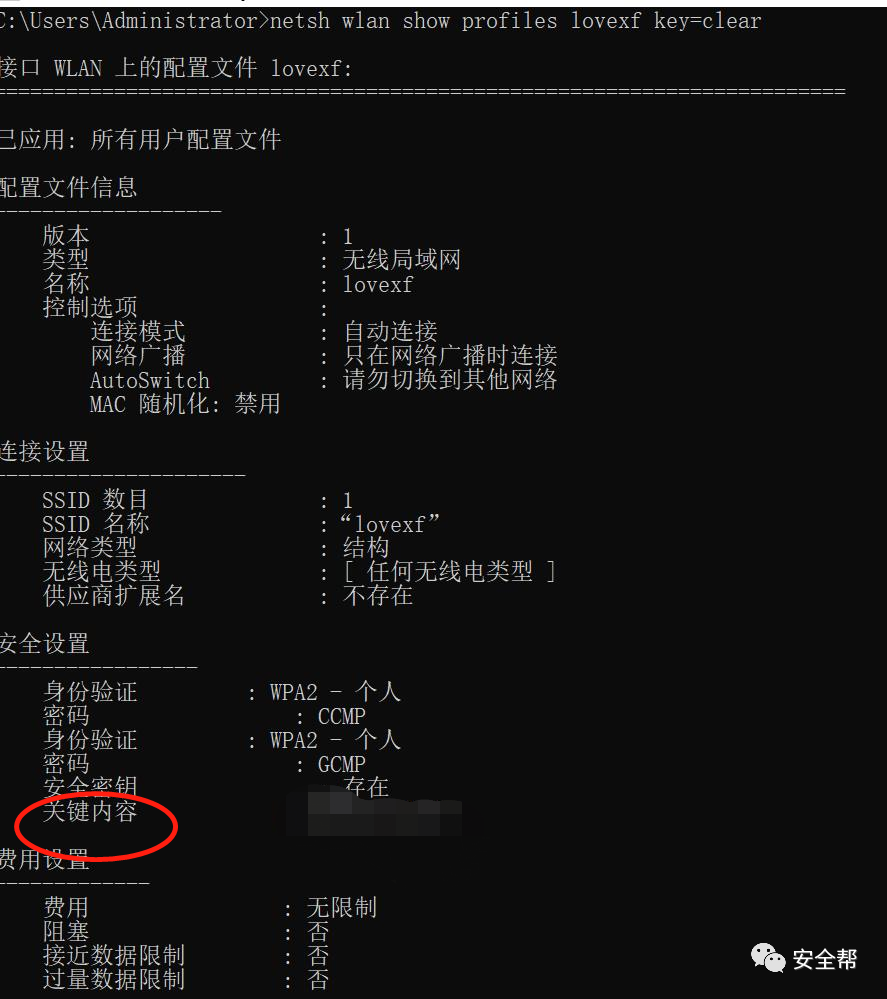 2.再执行netsh wlan show profiles wifi-名称 key-clear,即可显示所查询对应名称的WiFi密码,其中关键内容就表示WiFi密码。