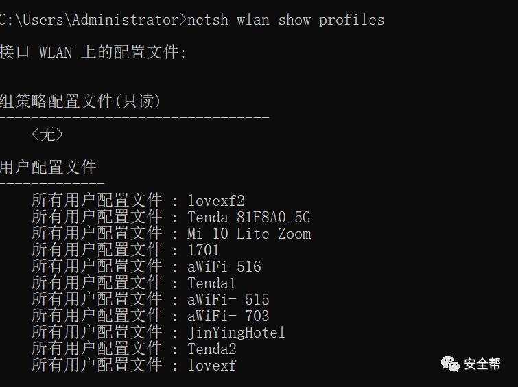 1.运行CMD,运行netsh wlan show profiles即可查看笔记本电脑曾经连接过的所有无线网络的名称;