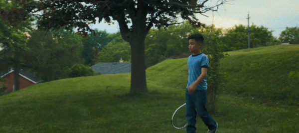 一个可爱的小男孩,在一位西装革履的中年男人教导下打网球。