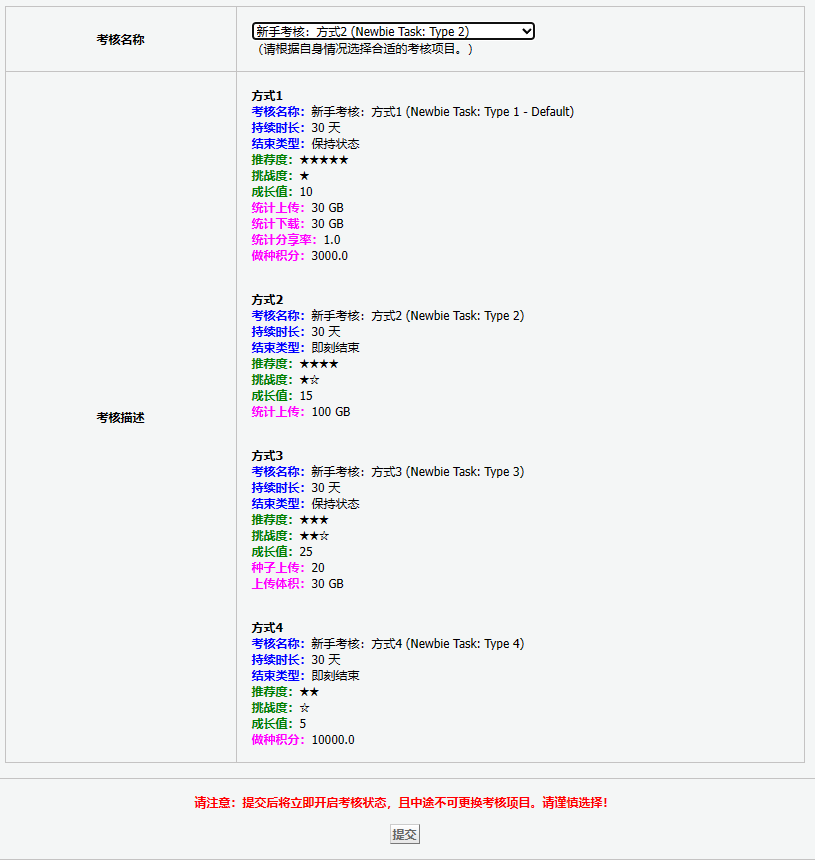这个站资源看似挺多,但保种不是很理想。新人考核倒是挺人性化,还给出几个选择。比如你如果上传速度不是很好,可以选择方式4,多做种赚积分就行。如果是上传给力的,不想保太多种,可以选择方式2。