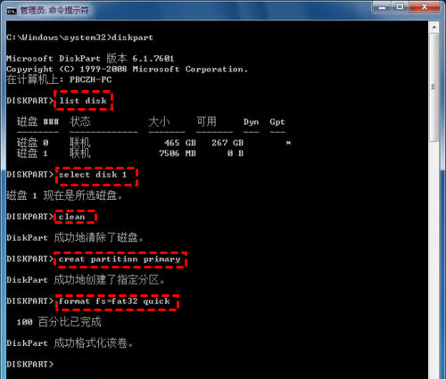 format fs=fat32 quick(如果要格式化为NTFS,请将fat32替换为ntfs)。