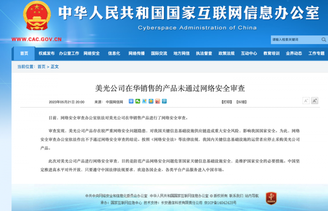 今年3月底,中国国家互联网信息办公室下设的网络安全审查办公室(下称网信办)依法对美国美光公司(Micron)在华销售产品进行了网络安全审查。5月21日,网信办发布通知称,经审查发现,美光公司产品存在较严重网络安全问题隐患,对我国关键信息基础设施供应链造成重大安全风险,影响我国国家安全。为此,网络安全审查办公室依法作出不予通过网络安全审查的结论。按照《网络安全法》等法律法规,我国内关键信息基础设施的运营者应停止采购美光公司产品。此次对美光公司产品进行网络安全审查,目的是防范产品网络安全问题危害国家关键信息基础设施安全,是维护国家安全的必要措施。中国坚定推进高水平对外开放,只要遵守中国法律法规要求,欢迎各国企业、各类平台产品服务进入中国市场。美光是全球存储芯片三巨头之一,总部位于美国爱达荷州博伊西,其存储产品主要用于手机、电脑、数据中心、汽车和其他电子产品,2022年收入来自中国市场收入从此前高峰57%降至2022年约11%。根据市场咨询机构 Omdia(IHS Markit)统计,2021 年三星电子、 铠侠、西部数据、SK 海力士、美光、Solidigm 在全球 NAND Flash (闪存)市场份额约为 96.76%,三星电子、 SK 海力士、美光在全球 DRAM (内存)市场份额约为 94.35%。目前,美光在全球DRAM/NAND Flash市场分别占据25%和12%的份额,在车用存储市场占比超40%份额。根据TrendForce数据,由于部分海外大厂减产,相较今年第一季DRAM均价跌幅近20%,预估第二季跌幅有望收敛至10%—15%,美光表示当前客户库存正在好转,预计行业供需平衡将逐步改善。分析认为,此次美光安全审查未通过,将极大利好国产存储芯片公司长江存储、长鑫存储等,及上游设备厂商。事实上,美光早已卷入了中国在先进半导体技术上实现自给自足的进程之中。早在2017年,美光曾起诉联电及其合作伙伴福建省晋华集成电路有限公司,声称它们窃取了商业机密。2018年1月,联电起诉美光,指控美光在中国侵犯了与内存存储及其他产品有关的专利。该公司寻求制止美光制造、进口或销售涉嫌侵权的产品,同时销毁所有库存并支付赔偿金。2018年7月3日,联电发布公告称,在一项有利于联电的专利裁决中,福州中级人民法院发布了初步禁令,要求美光停止销售26种产品,包括动态随机存取存储器和NAND闪存相关产品。在今年 3 月份宣布对美光公司在华销售产品启动网络安全审查后,美光曾在一份声明中称:“已知晓中国网络安全和信息化委员会办公室(网信办)宣布对我们在华销售的产品启动网络安全审查。我们正与网信办进行积极沟通和全力配合。” 美光科技强调,坚持其产品的安全性和对客户的承诺。不过有分析师指出,美光在中国销售的产品有很大部分是由惠普、戴尔、苹果等外国制造商购买,目前还不清楚网信办的决定是否会影响这些外国买家。