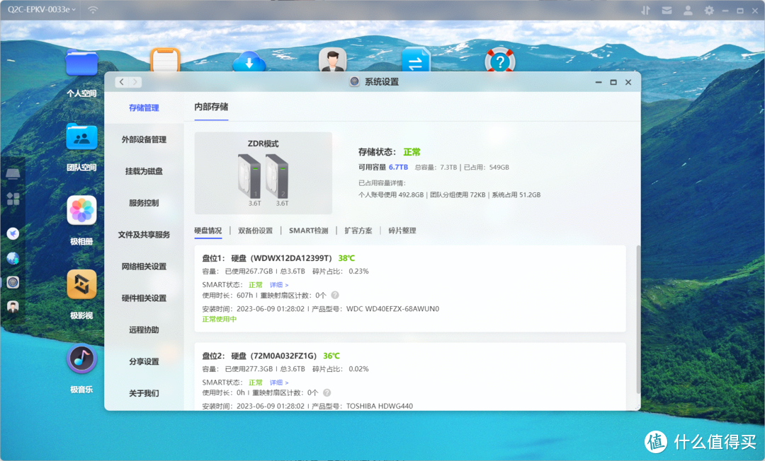 极空间Q2C支持RAID1与ZDR模式,足够普通玩家使用了。ZDR是极空间自研动态双备份模式,硬盘容量大小可以不同,系统会把设置为“双备份”的内容,在两块硬盘上相互备份,以保证数据安全。其余内容仅存一份,这样硬盘的利用率比RAID1高,能存储更多的数据,也具备相当的安全性,更加省事。