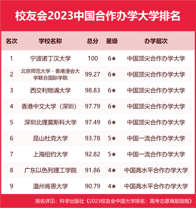宁波诺丁汉大学、北京师范大学-香港浸会大学联合国际学院、西交利物浦大学位列2023中国合作办学大学排名前3强。