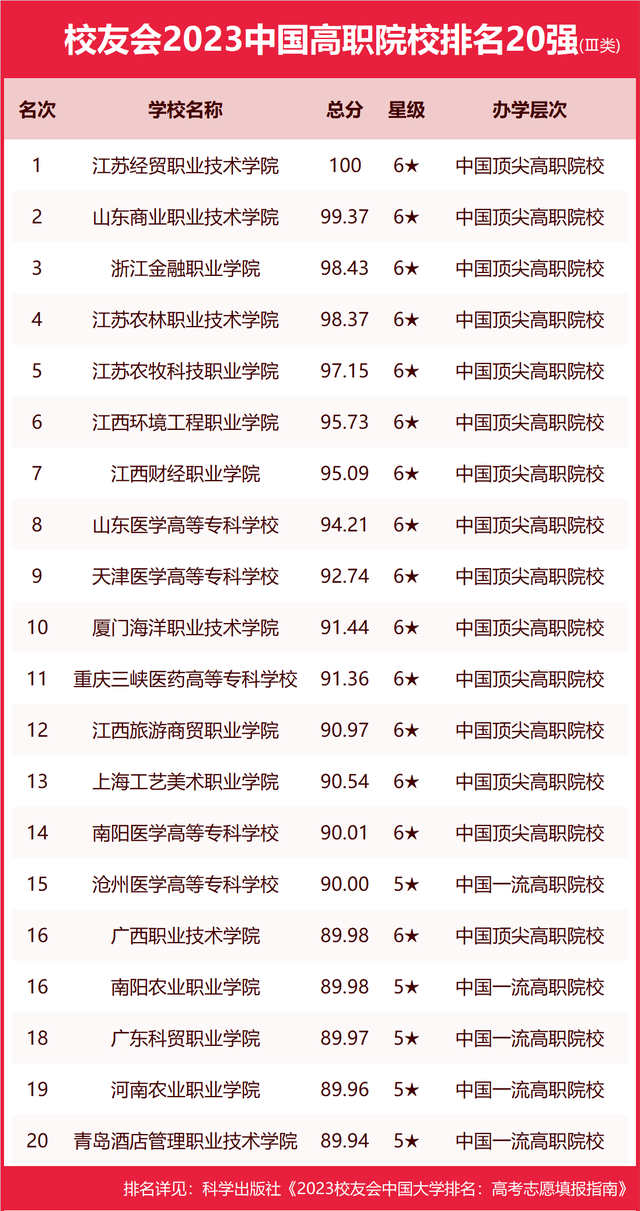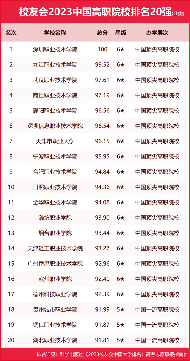 黄河水利职业技术学院、长沙民政职业技术学院、无锡职业技术学院名列2023中国高职院校排名I类前3强。深圳职业技术学院、九江职业技术学院、武汉职业技术学院位列2023中国高职院校排名Ⅱ类前3强。江苏经贸职业技术学院、山东商业职业技术学院、浙江金融职业学院名列2023中国高职院校排名Ⅲ类前3名。