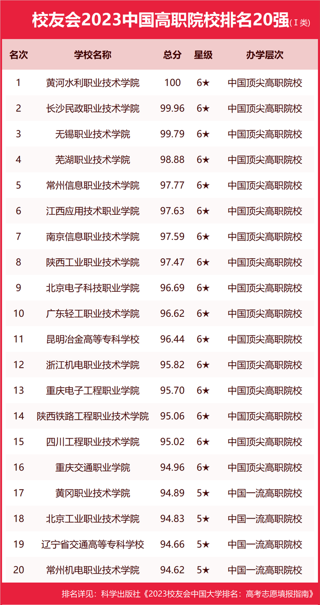 在最新2023中国高职院校排名中,黄河水利职业技术学院、长沙民政职业技术学院、无锡职业技术学院、芜湖职业技术学院、常州信息职业技术学院、江西应用技术职业学院、南京信息职业技术学院、陕西工业职业技术学院、北京电子科技职业学院、广东轻工职业技术学院雄居校友会2023中国高职院校排名I类前10强。