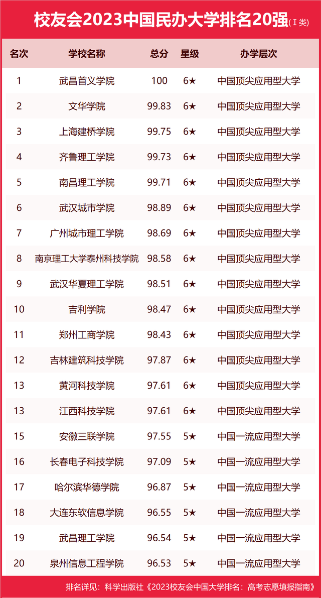 在最新校友会2023中国民办大学排名中,武昌首义学院、文华学院、上海建桥学院、齐鲁理工学院、南昌理工学院、武汉城市学院、广州城市理工学院、南京理工大学泰州科技学院、武汉华夏理工学院、吉利学院雄居校友会2023中国民办大学排名I类前10强。