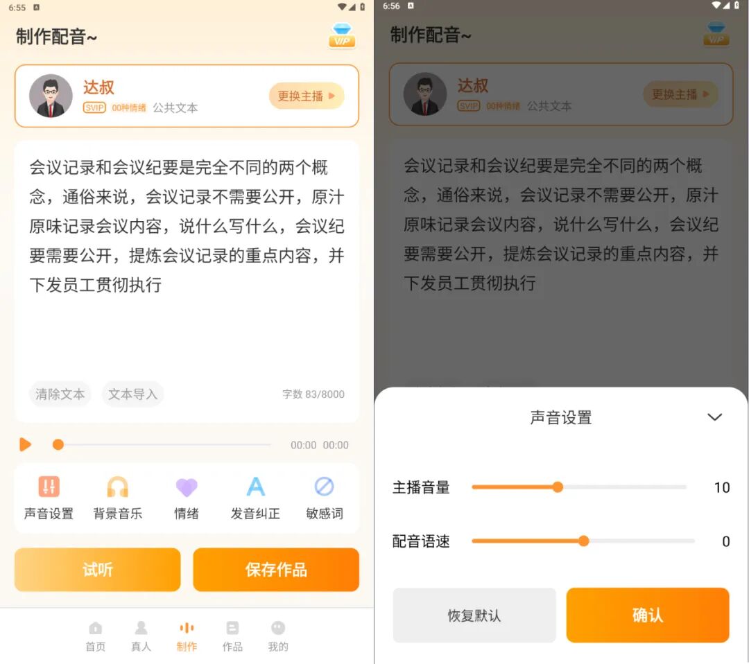 目前的这个版本是无広告,登录即可食用。像一些企业宣传、解说配音、広告促销、自媒体配音都可以用的上。非常的方便。喜欢的赶紧下载吧。