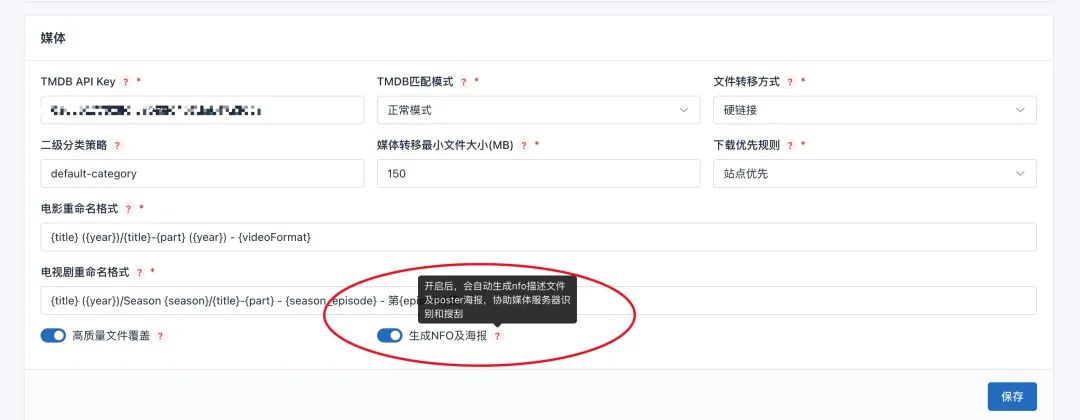 https://github.com/jxxghp/nas-tools 抽了点时间安装配置好了这个自动化整理工具 不得不说效果是很不错,就是头一次用需要研究研究 配合下载器使用,能搜刮海报信息 搜刮需要用到 TMDB 的 API Key,具体参考网上的教学 默认用户名密码 admin password 设置好后,用手机也能远程操作下载 更多信息欢迎QQ群内交流或加微信入微信群 微信扫描下方的二维码阅读本文Related Posts:升级至Kodi 17.2 Krypton 修补主要安全缺陷(05/23/2017)安装Velocity Kids控制孩子的观看如何安装 Crew Kodi 插件擦拭干净,并用最新的扩展中心重新配置Kodi如何在不越狱的iOS上安装Kodi2025电视机推荐+选购指南-7月更新(选购要点,产品型号,品牌推荐,有无开机广告等)丨索尼、海信/Vi… 文章导航 Kodi “Leia” 18.9 发布 略懂的大龙猫:群晖休矣?新协议禁止被列入美国实体清单者使用